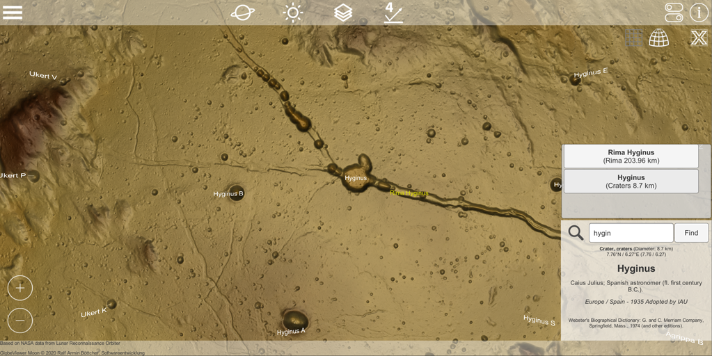 The interactive 3D moon map can be adapted to the various requirements of different users. The rotation view, which is active after starting the app, is intended for users who want general information about the moon and its surface. Here, in favor of optimal illumination of the surface, realistic moon lighting is deliberately avoided.