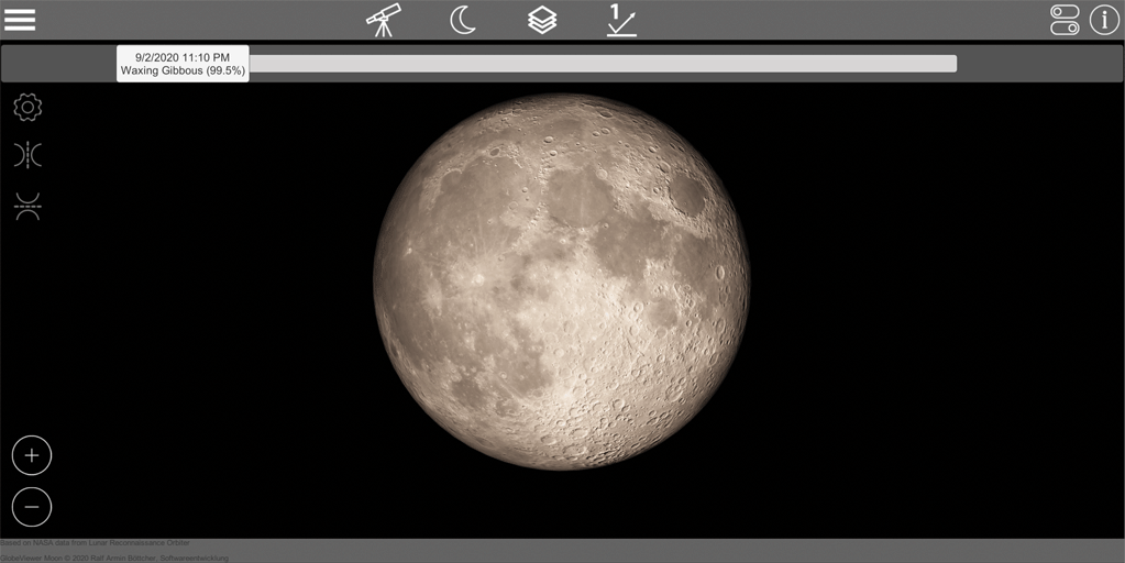 If you use the telescope mode, you can use the slider to move the current moon phase i.e. the viewing time back and forth in order to take a closer look at the visible moon areas. For correct surface shading, please use the texture gray in conjunction with a surface detail level.