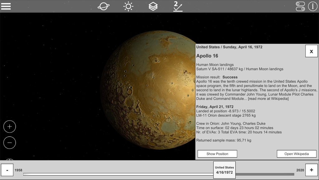 You can open the mission list using the symbol at the bottom left. It includes all previous moon missions since 1958. All missions that have a landing site can be centered on the globe. More information about the missions can be found on Wikipedia.